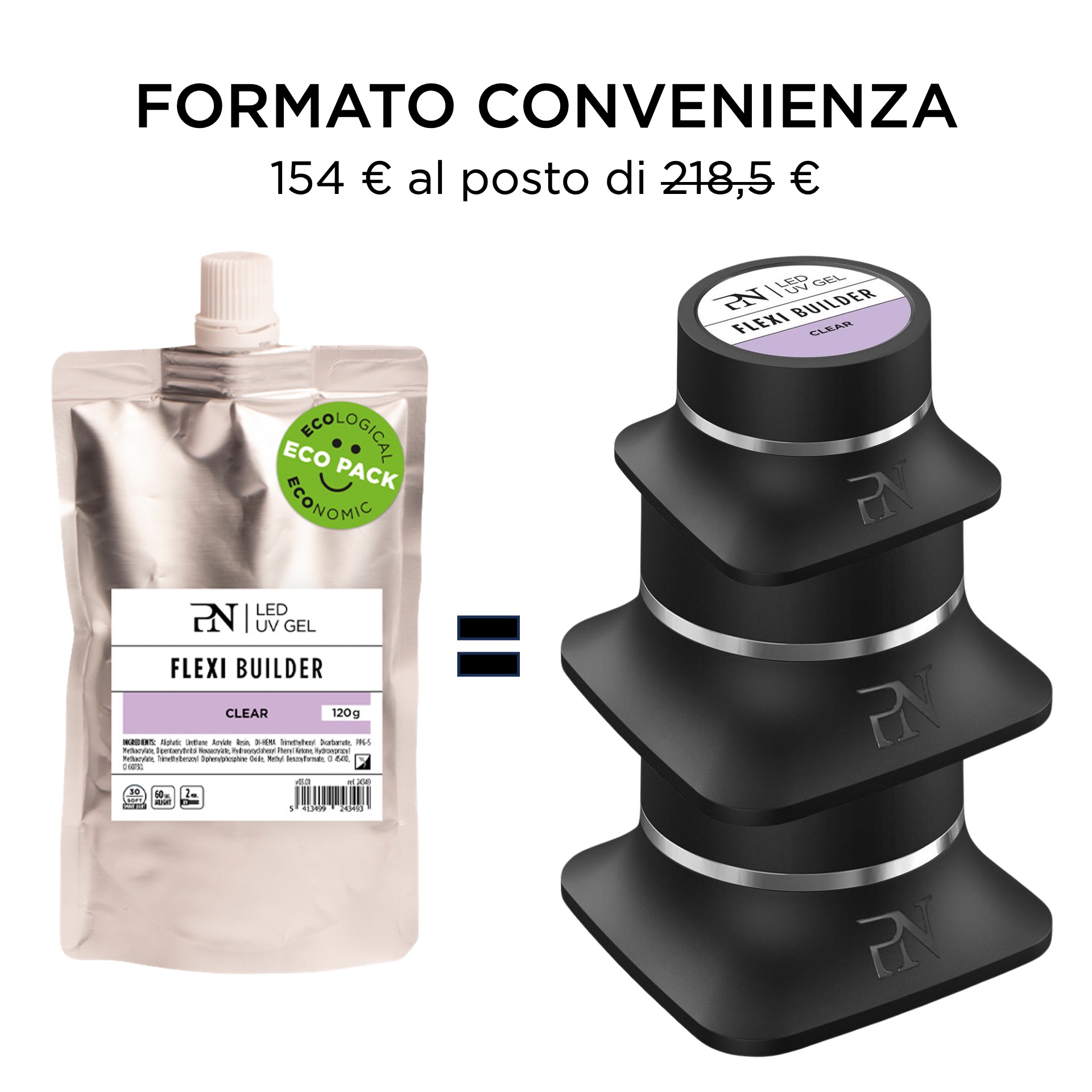 L’Eco Pack Refill Flexi Builder Clear da 120 g è la versione ricarica del Flexi Builder Clear ProNails, ideale per unghie flessibili e coperture medio-corte.