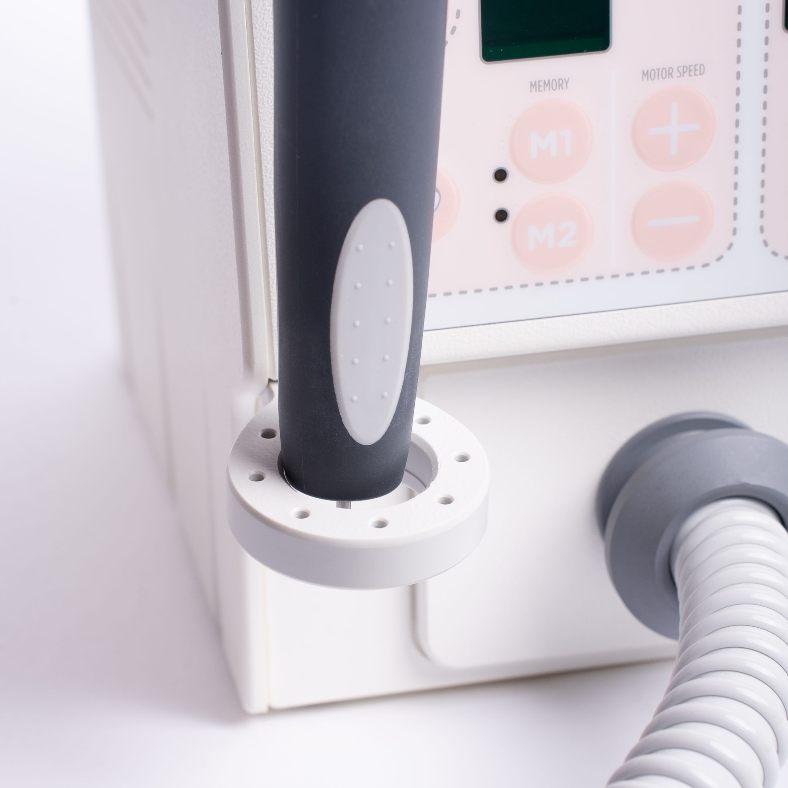 Durante la fresatura, il manipolo aspira immediatamente la polvere nel punto esatto in cui si genera: questo non solo migliora la visibilità e la precisione, ma mantiene la postazione pulita, professionale e più sicura sia per te che per la cliente.